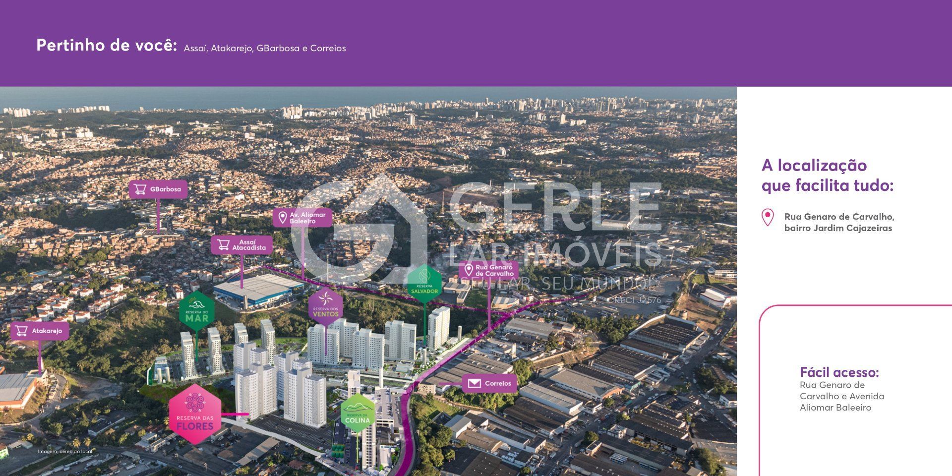Situado na Rua Genaro de Carvalho, em Jardim Cajazeiras, o Reserva das Flores está em uma região tradicional e em constante valorização de Salvador. O bairro oferece uma infraestrutura completa, com fácil acesso a importantes vias como a Avenida Aliomar Baleeiro, facilitando a mobilidade pela cidade.