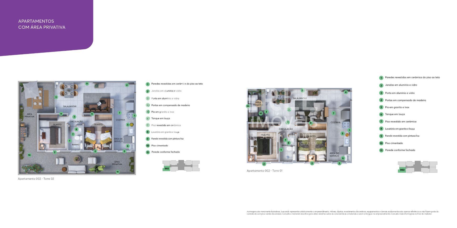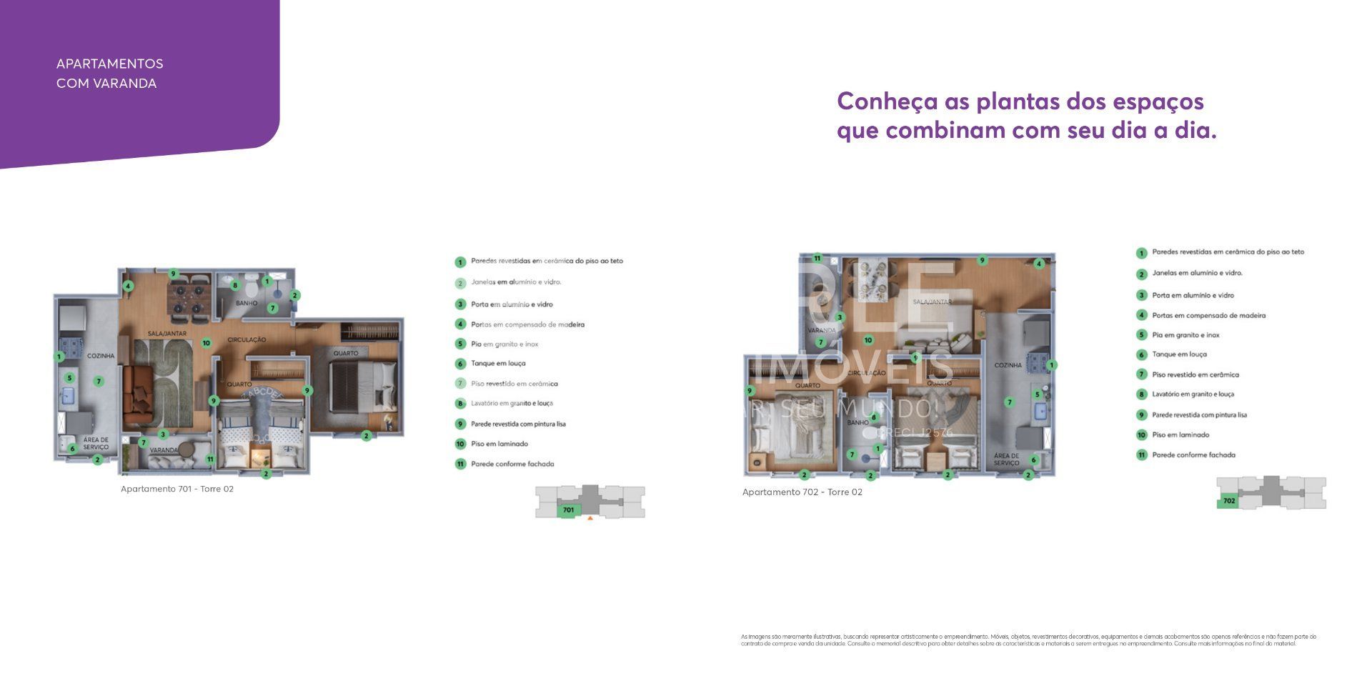 Os apartamentos foram planejados para proporcionar funcionalidade e conforto, com possibilidade de varanda e área privativa, além de acabamentos de qualidade, como bancadas em granito na cozinha e banheiro, revestimento completo nas áreas molhadas e previsão para ar-condicionado. Tudo isso aliado a soluções inteligentes que promovem economia, como dispositivos economizadores de água e energia.